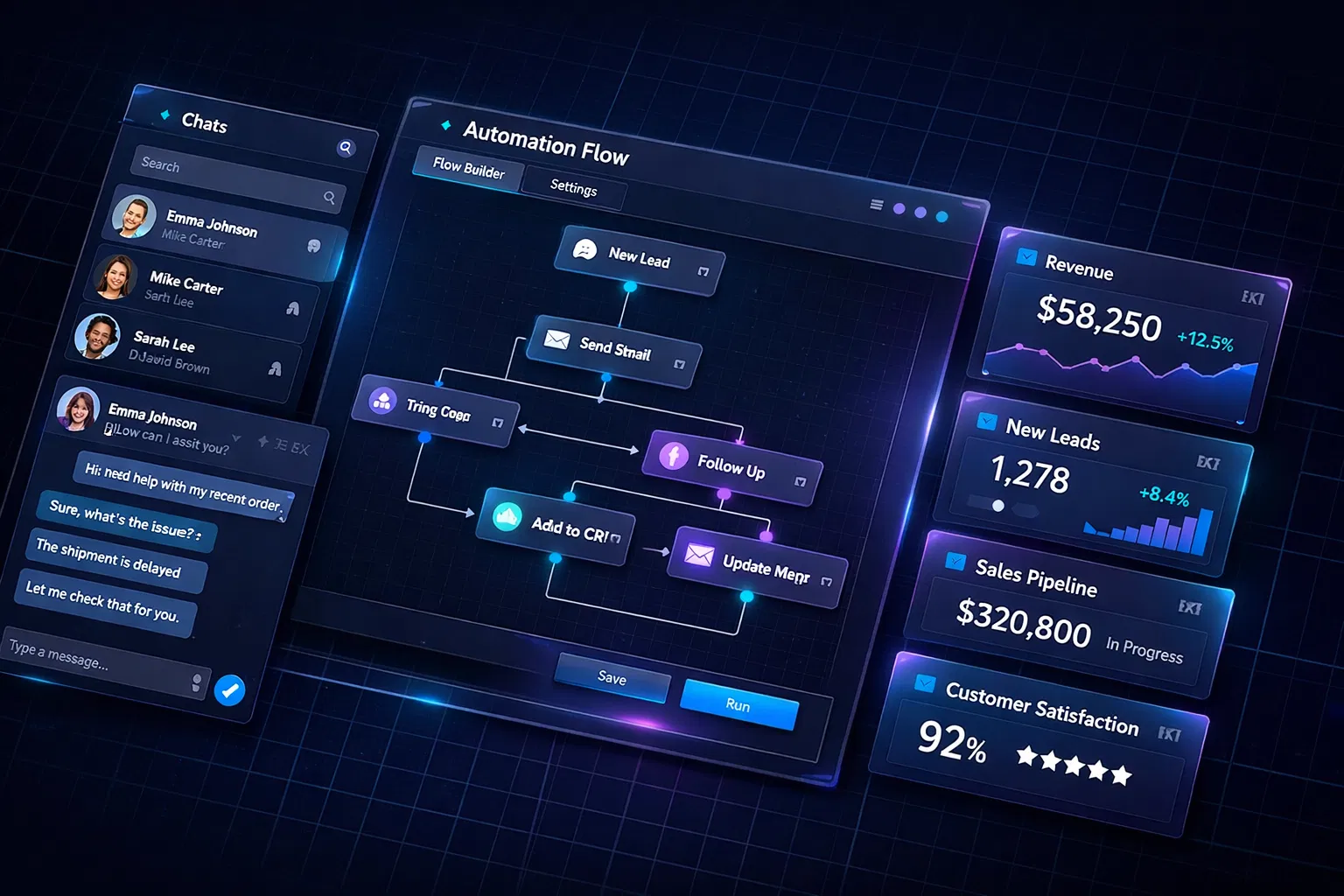 Uma plataforma multiempresa que une gestao empresarial, CRM conversacional, Flow Builder, agentes de IA, campanhas, API publica, webhooks e FluxHub em uma operacao rastreavel.